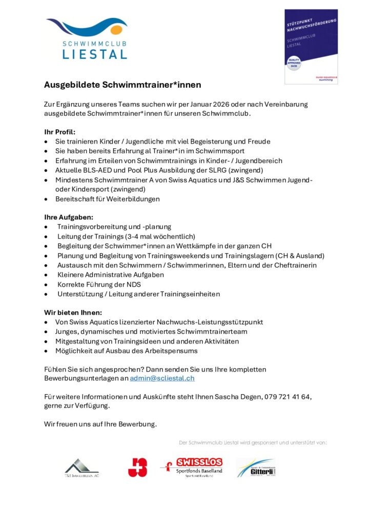 Zur Ergänzung unseres Teams suchen wir per Januar 2026 oder nach Vereinbarung ausgebildete Schwimmtrainer*innen für unseren Schwimmclub.